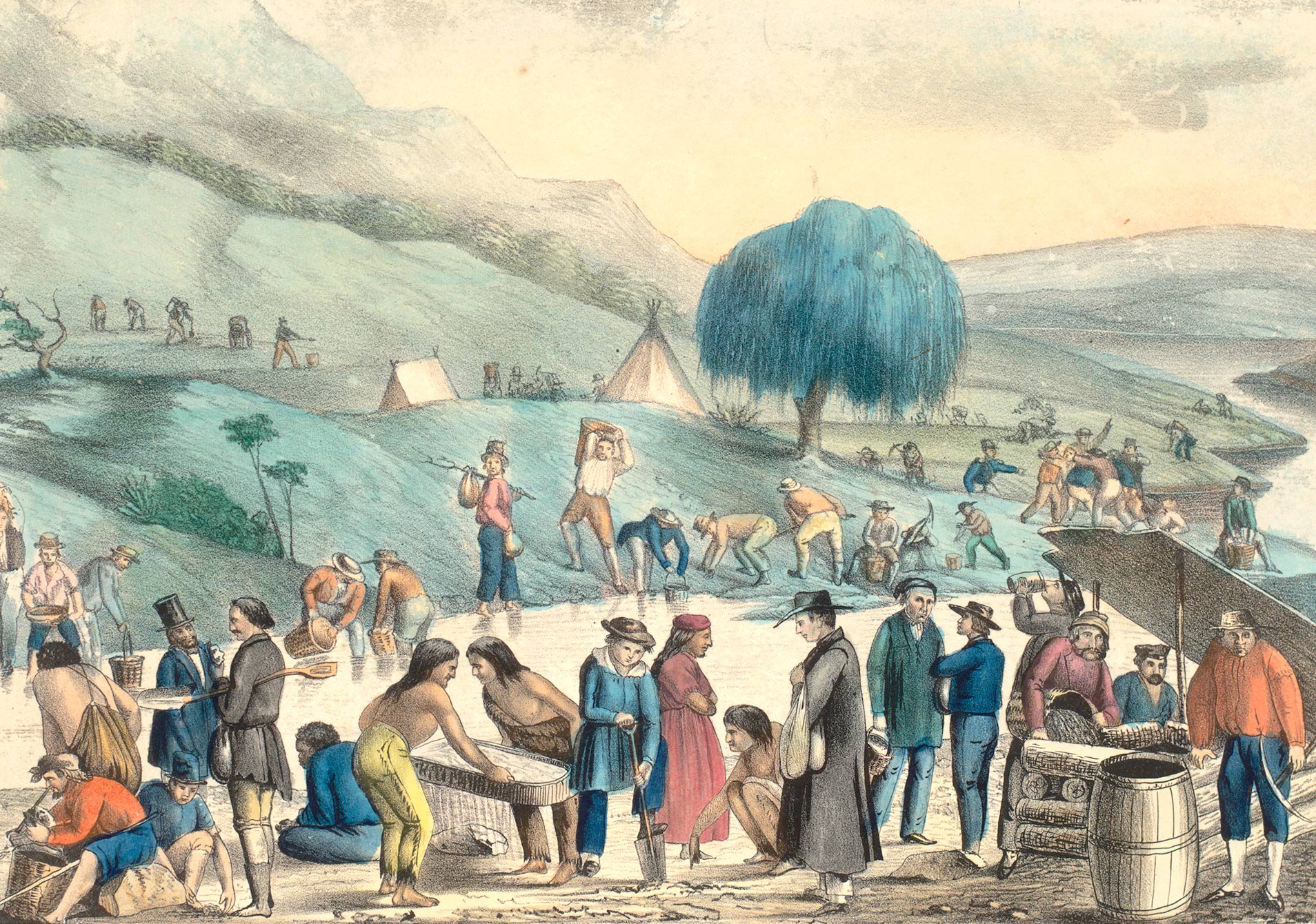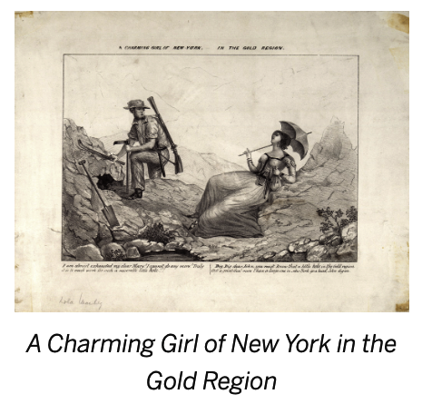 (circa 1849) While male miners greatly outnumbered female ones, some women did venture to California during the Gold Rush. Some set up camp and prospected for gold, but many stayed in town where they made a living providing services for the miners such as cooking, cleaning, and clothes laundering. Excerpt: “Letter the Tenth: Amateur Mining—Hairbreadth ’Scapes, &c.” from The Shirley Letters from California Mines in 1851–1852 Author: Dame Shirley (Louise Amelia Knapp Smith Clappe) Printed by: Thomas C. Russell, San Francisco, CA Published: 1922 (public domain) 1 From our Log Cabin, INDIAN BAR, November 25, 1851. 2 NOTHING of importance has happened since I last wrote you, except that I have become a mineress, that is, if the having washed a pan of dirt with my own hands, and procured there from three dollars and twenty-five cents in gold-dust, which I shall inclose in this letter, will entitle me to the name. I can truly say, with the blacksmith’s apprentice at the close of his first day’s work at the anvil, that I am sorry I learned the trade, for I wet my feet, tore my dress, spoilt a pair of new gloves, nearly froze my fingers, got an awful headache, took cold, and lost a valuable breastpin, in this my labor of love. After such melancholy self-sacrifice on my part, I trust you will duly prize my gift. I can assure you that it is the last golden handiwork you will ever receive from Dame Shirley. 3 Apropos of lady gold-washers in general, it is a common habit with people residing in towns in the vicinity of the diggings to make up pleasure-parties to those places. Each woman of the company will exhibit, on her return, at least twenty dollars of the oro, which she will gravely inform you she has just panned out from a single basinful of the soil. This, of course, gives strangers a very erroneous idea of the average richness of auriferous dirt. I myself thought (now, don’t laugh) that one had but to saunter gracefully along romantic streamlets on sunny afternoons, with a parasol and white kid gloves perhaps, and to stop now and then to admire the scenery, and carelessly rinse out a small panful of yellow sand (without detriment to the white kids, however, so easy did I fancy the whole process to be), in order to fill one’s workbag with the most beautiful and rare specimens of the precious mineral. Since I have been here I have discovered my mistake, and also the secret of the brilliant success of former gold-washeresses. 4 The miners are in the habit of flattering the vanity of their fair visitors by scattering a handful of “salt” (which, strange to say, is exactly the color of gold-dust, and has the remarkable property of often bringing to light very curious lumps of the ore) through the dirt before the dainty fingers touch it, and the dear creatures go home with their treasures, firmly believing that mining is the prettiest pastime in the world. 5 I had no idea of permitting such a costly joke to be played upon me; so I said but little of my desire to “go through the motions” of gold-washing, until one day, when, as I passed a deep hole in which several men were at work, my companion requested the owner to fill a small pan, which I had in my hand, with dirt from the bed-rock. This request was, of course, granted, and the treasure having been conveyed to the edge of the river, I succeeded, after much awkward maneuvering on my own part, and considerable assistance from friend H., an experienced miner, in gathering together the above-specified sum. All the diggers of our acquaintance say that it is an excellent “prospect,” even to come from the bed-rock, where, naturally, the richest dirt is found. To be sure, there are, now and then, “lucky strikes,” such, for instance . . . where a person took out of a single basinful of soil two hundred and fifty-six dollars. But such luck is as rare as the winning of a hundred-thousand-dollar prize in a lottery. We are acquainted with many here whose gains have never amounted to much more than wages, that is, from six to eight dollars a day. And a claim which yields a man a steady income of ten dollars per diem is considered as very valuable.