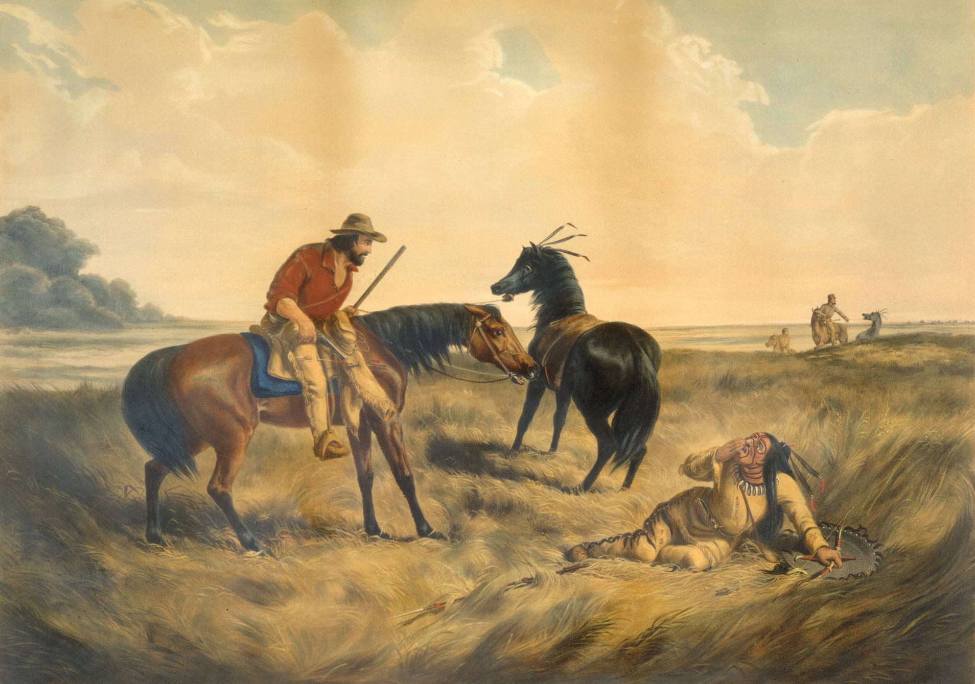 The Last War-Whoop by A. F. Tait (1856) A trapper observes a wounded Native American after a fight.