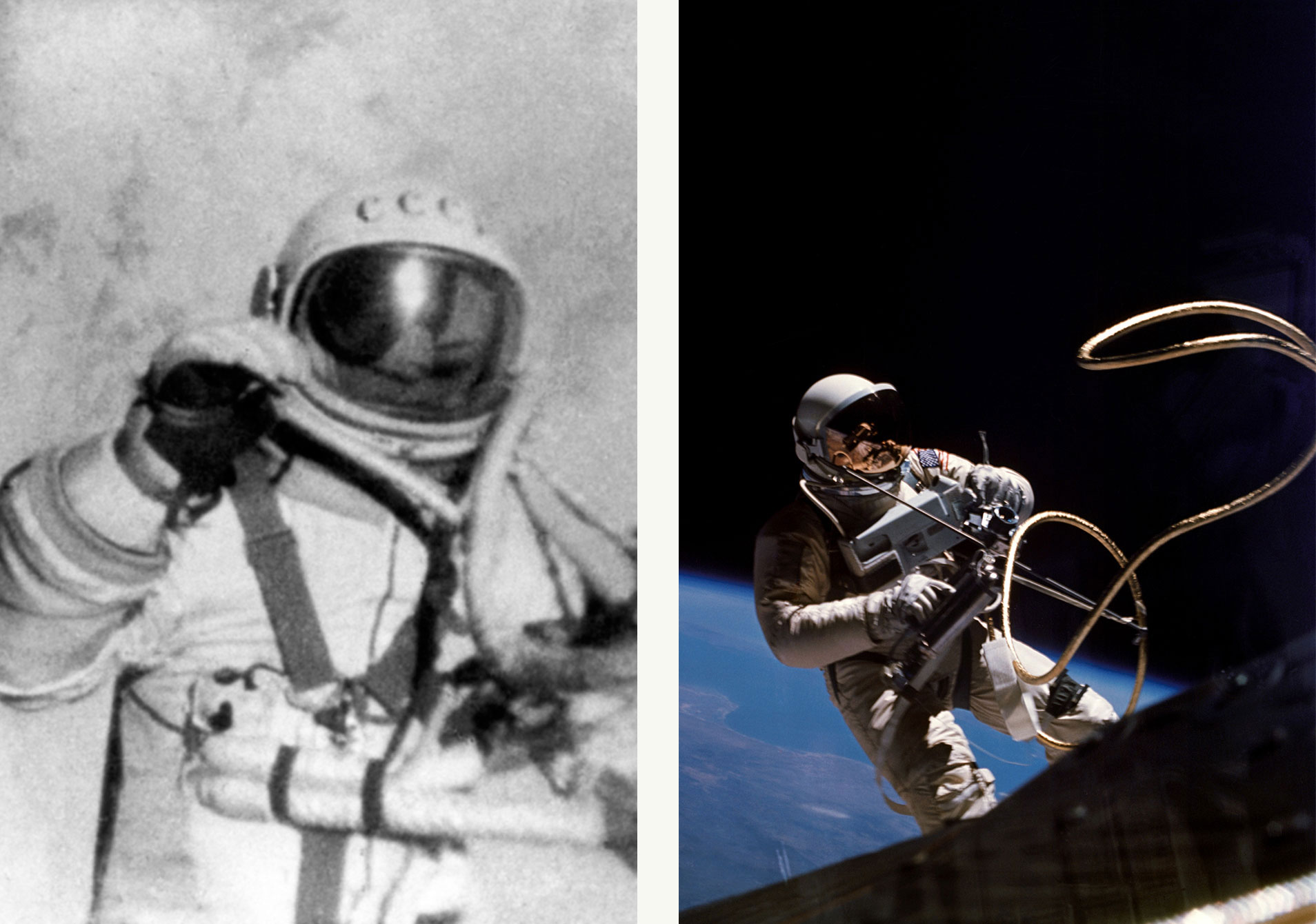 Compare the two spacewalk photographs. List two differences and two similarities.