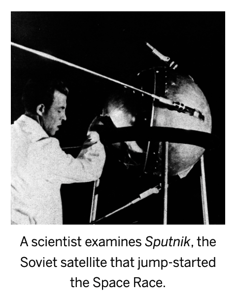 5 The Space Race roared to life on October 4, 1957, when the Soviets mounted a satellite onto a rocket and launched it into orbit. It was named Sputnik, meaning “fellow traveler of Earth,” and it circled the globe every 92 minutes at a speed of 18,000 miles per hour. The world was stunned, and the Americans were embarrassed and worried. How could the Soviets have beaten them into orbit?
