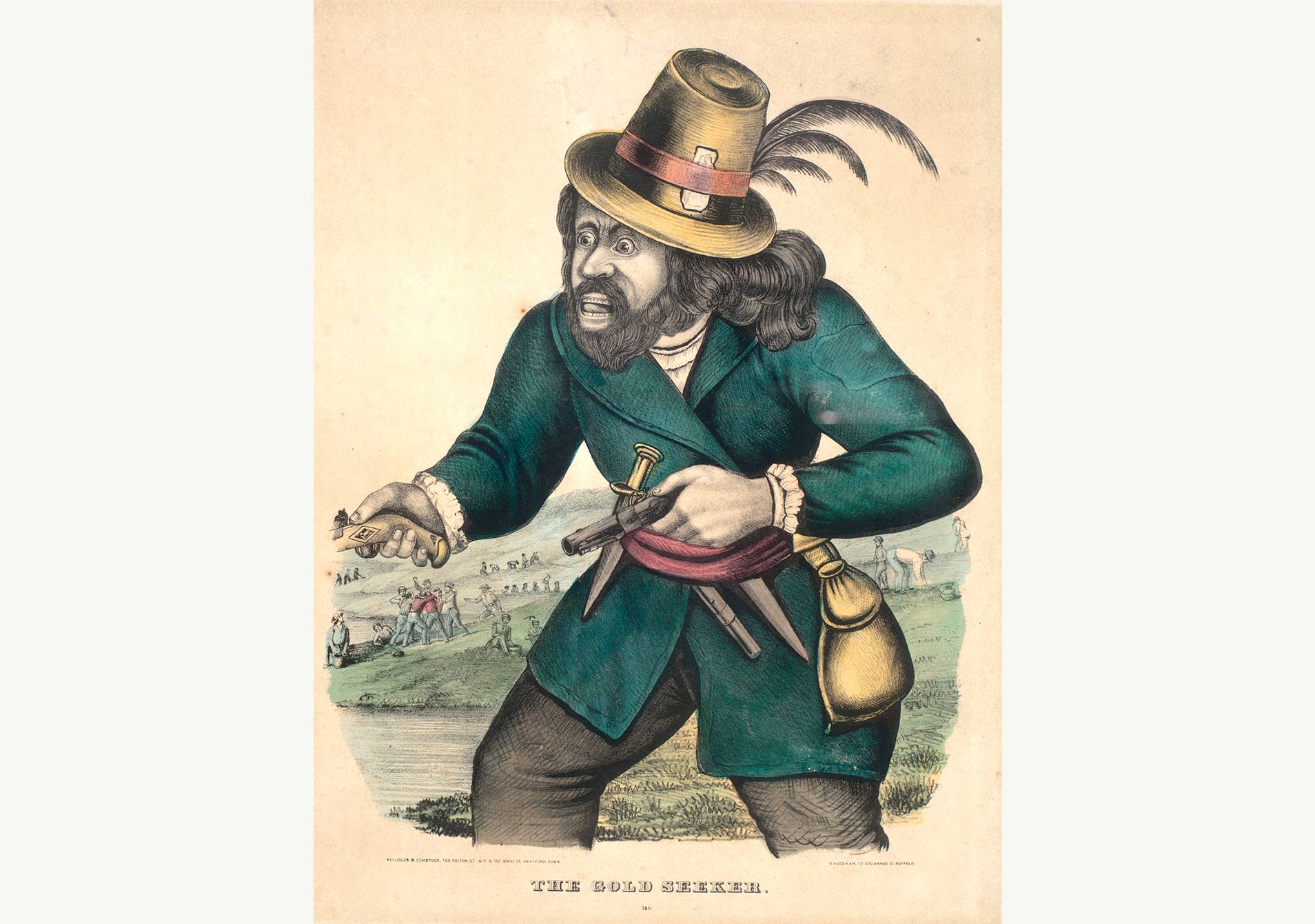 How many weapons does the gold seeker have? What does this say about what life was like during the gold rush?