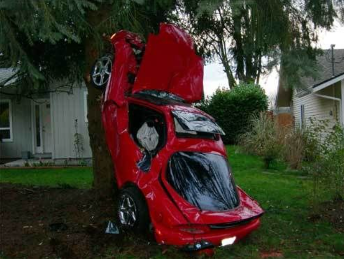 If a car hits a tree, what occurs?