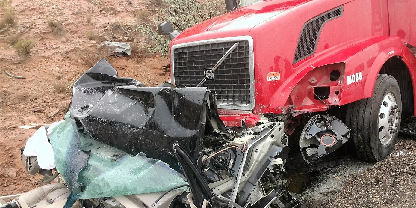 You notice the semi-truck appears to have sustained very little damage while the sports car appears truly beat up.