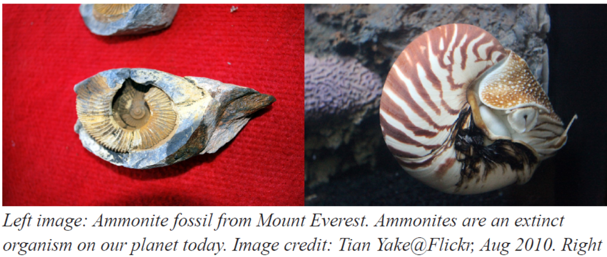 But did you know that at the top of many of the frozen peaks of the Himalayan Mountain range are fossils from an ancient sea? High up on the top of Mount Everest is a sedimentary rock that was laid down in the Ordovician age nearly 400 million years ago in the shallow Tethys Sea, which has long since dried up. The left photograph below is an image of an ammonite that lived in that sea. So how does a fossil like this one get to the highest point on the top of the tallest Mountain in the world? Very, very slowly.