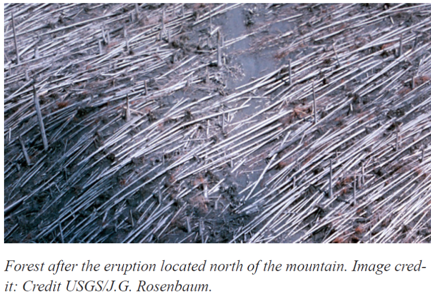 Eruptions like this one transfer a tremendous amount of energy from inside the Earth. This eruption was so powerful that it was equivalent to 1600 times the strength of the atomic bomb that was dropped on Hiroshima in the second World War. Nearly 40 years later, the forest closest to the volcano is still a barren landscape of bare trees lying where they fell. Further away from the base, life is returning to the region. Lupines, a type of flowering plant, bring color to the landscape and provide food for gophers. Elk and deer have returned to the land. Eventually, more life will return and trees will grow again, slowly returning the forest to its previous state until the next eruption.