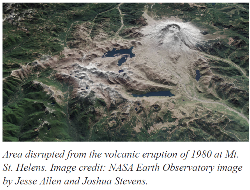 Landforms like mountain ranges and canyons take millions of years to drastically alter the landscape. That isn’t the case for volcanoes. The above figure shows a series of photographs of Mount St. Helens, located in Washington state. At the time of the first photograph, the active volcano had been rumbling for months. The North flank of the volcano (seen in the second image in the figure above) was swelling due to a shifting magma chamber. On the morning of May 18, 1980 a quake with magnitude 5.1 was detected coming from the volcano. In an unexpected turn, the North Flank of the volcano sloughed off the side of the mountain in just under 12 seconds becoming the largest landslide ever recorded.