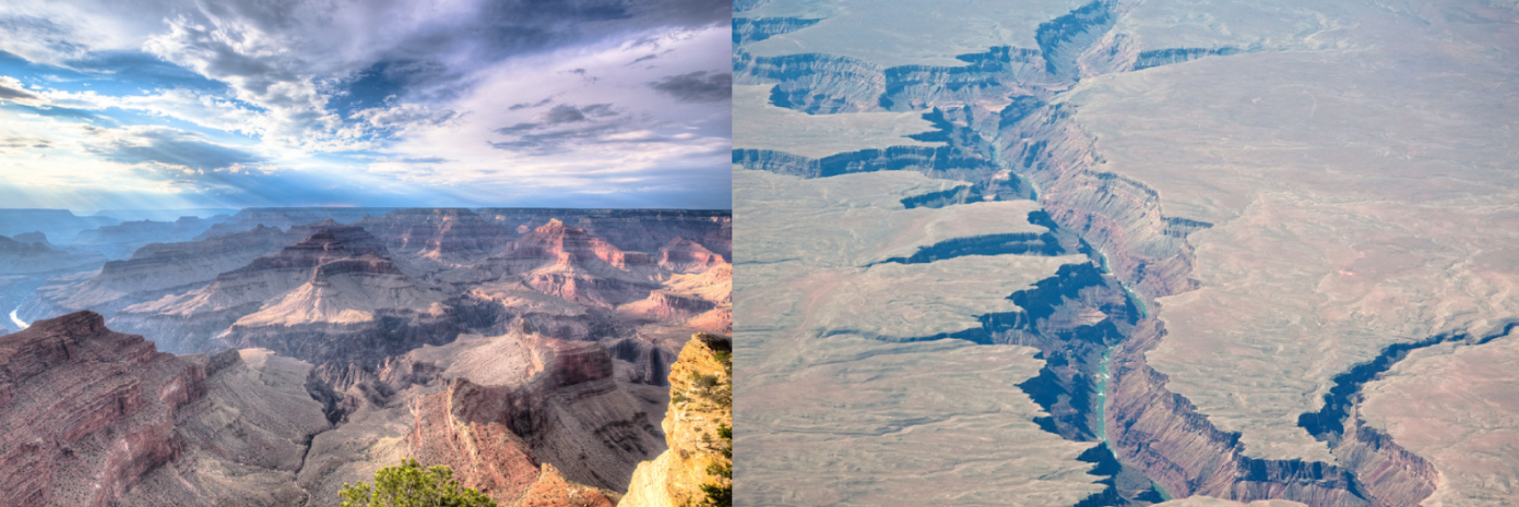 Take a look at the photos below of the Grand Canyon, Arizona. Grain by grain the Colorado river cut through what was once a flat plain. Slowly over the span of about 17 million years the Grand Canyon became the deep gorge it is today. As the river continues to flow, the canyon becomes deeper.