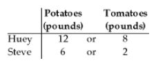 Huey and Steve can grow potatoes or tomatoes. The table above shows the pounds of potatoes and tomatoes Huey and Steve can grow in a week. Based on the table, which of the following statements is correct?