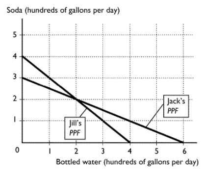 In the above figure, Jack's opportunity cost of producing 1 gallon of bottled water is ____ of soda.