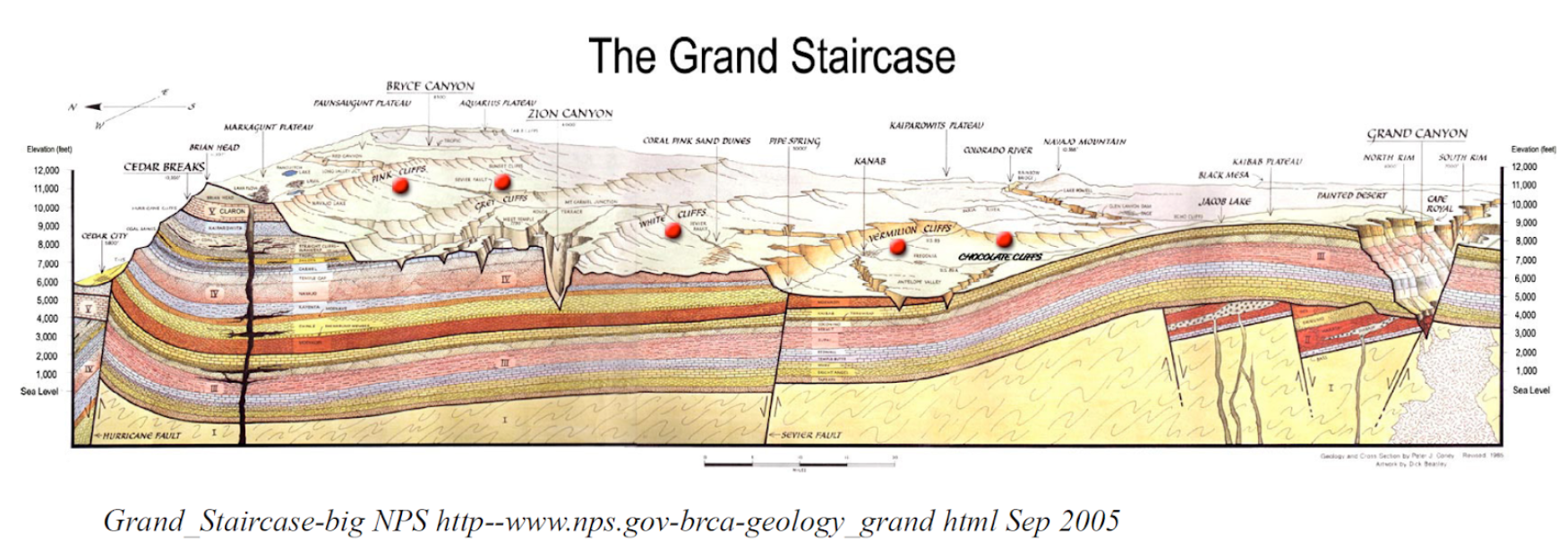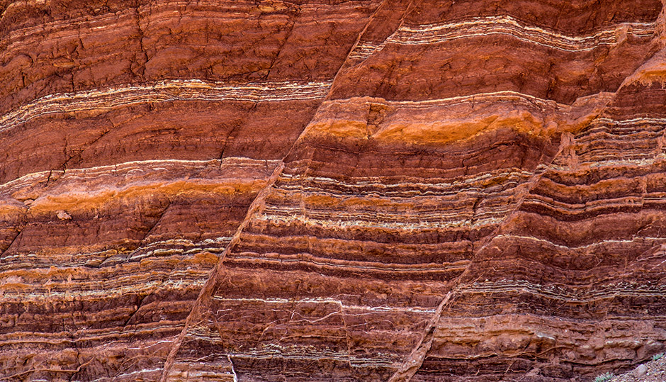 Sedimentary rocks, remember, are formed from sediments. Any type of rock is weathered and then eroded. Erosion occurs primarily from water, but also from wind. When these sediments become deposited, usually at the base of a mountain, in a river, lake or ocean, they can be compacted, cemented under pressure and become rock. Because of how they are deposited, sedimentary rocks will generally form large, horizontal strata (horizontal meaning parallel with the horizon, and strata meaning layer) that can stretch on for miles. This is what we call the Principle of Original Horizontality, the idea that most sedimentary deposits are laid down flat on the land surface. This understanding was first proposed by Danish geologist Nicholas Steno who lived in the mid-1600’s.
