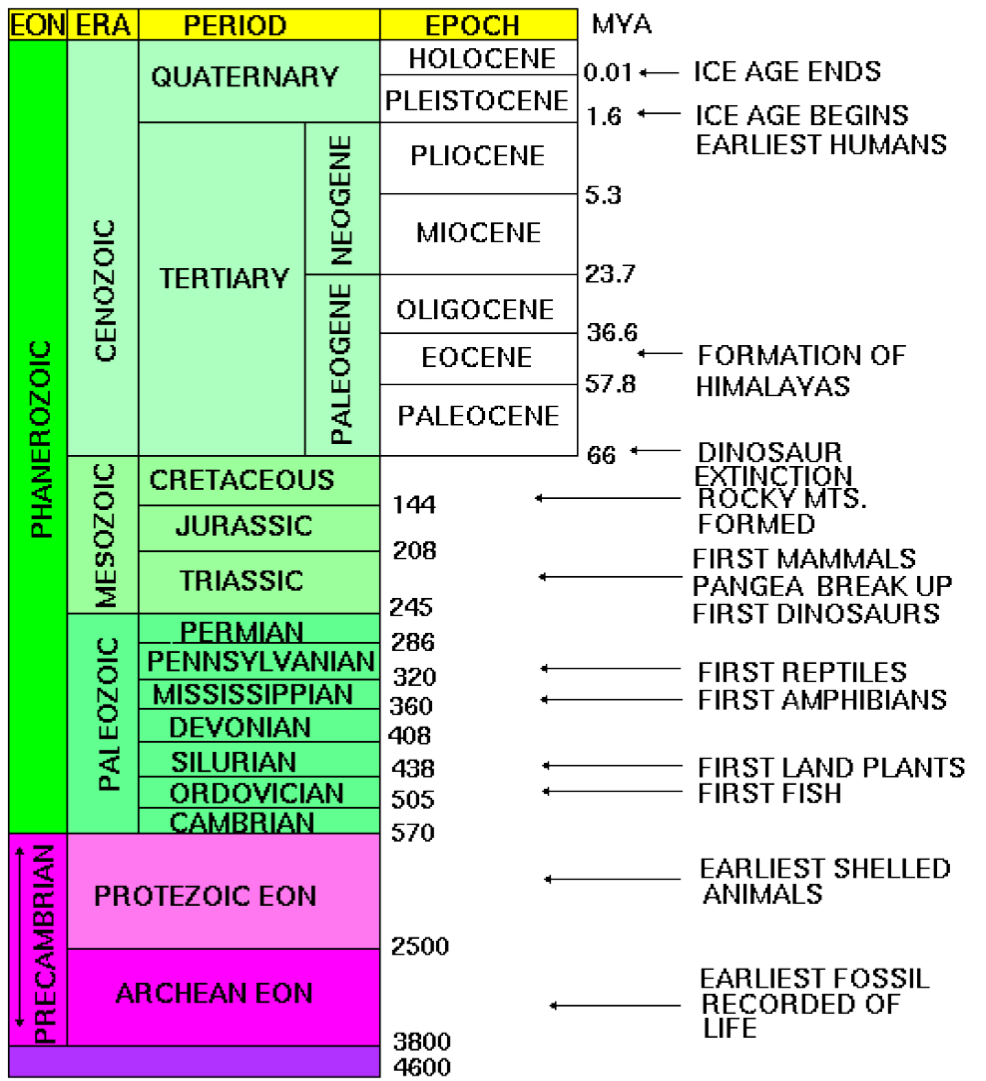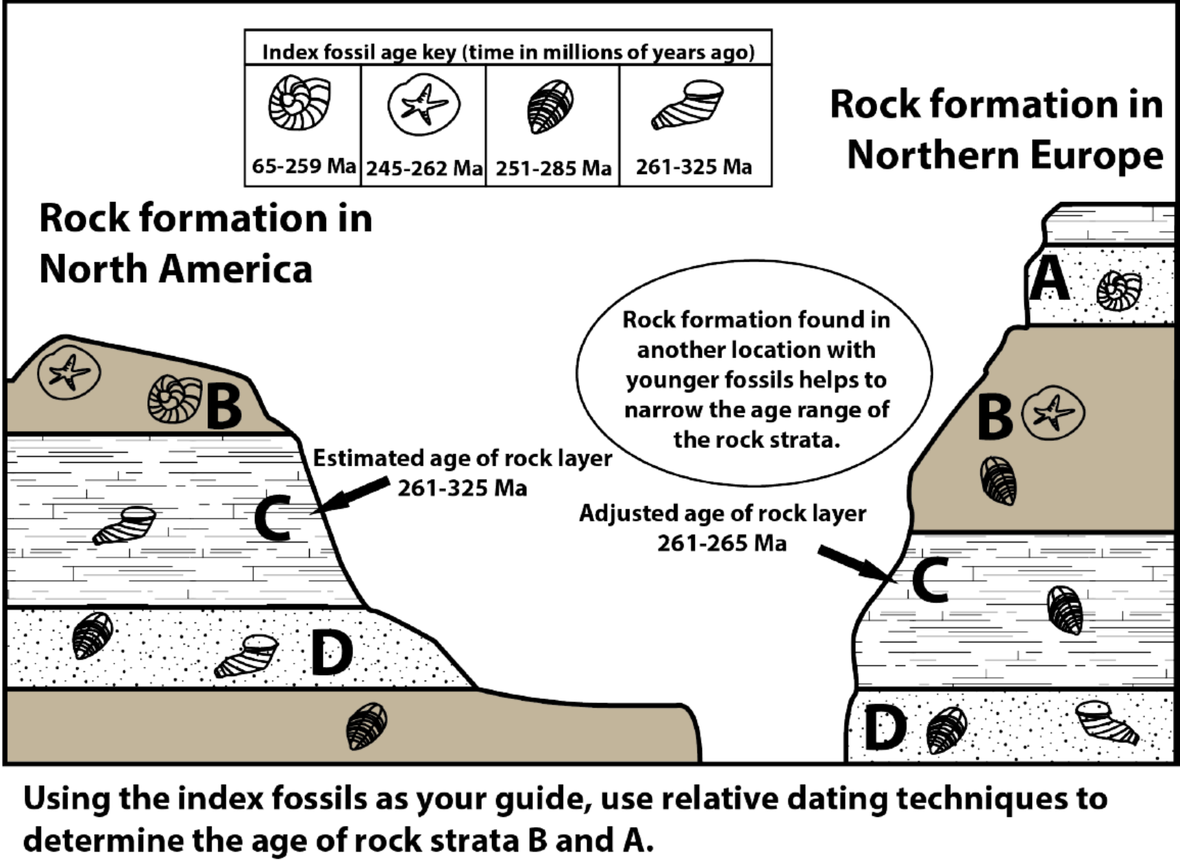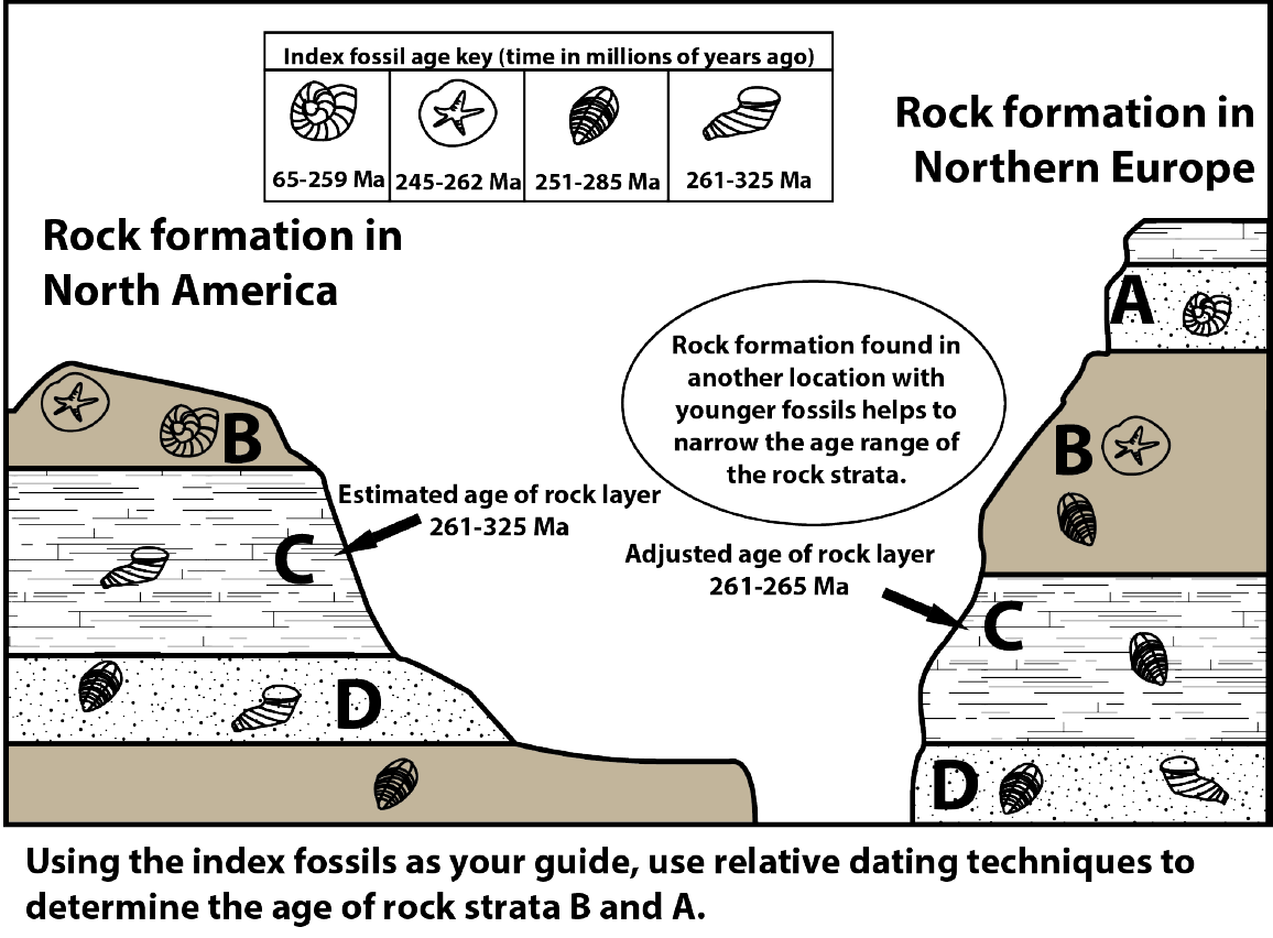 The diagram below is set up to help us understand how index fossils can be used. In the diagram there are two locations where the same rock strata have been found. In Layer C, a fossil is found from a horn coral that lived between 261-325 million years ago. This could give us a very large range of time for the relative age of this rock. However, the same rock formation is found in another location with a trilobite that lived between 251-285 million years ago. Because they formed in the same rock we can make the assumption that their species lived at the same time period. We can, therefore, narrow our age estimate of the rock formation by including only the time frame that overlaps from both species. In this case, that time frame is 261-265 million year ago.