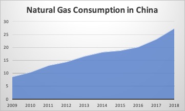 Using the example from the video, describe this graph using at least 3 sentences. (Hint: What does the graph show? Is natural gas consumption in China increasing or decreasing?)