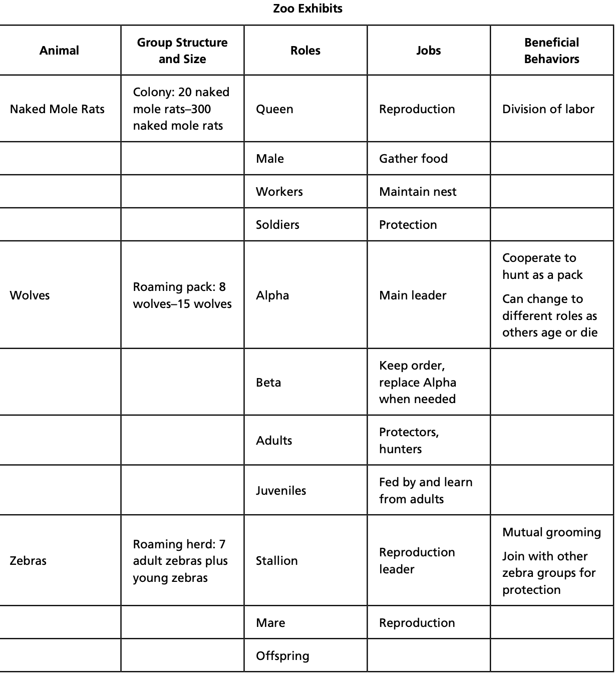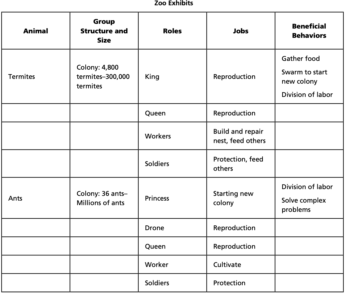 The zoo had an exhibit called “Living and Working Together” that showed different organisms that form groups to help themselves survive. Cindy visited the zoo and observed a number of different groups on exhibit. She learned the different ways they interact to help themselves survive. The charts describe the exhibits she saw.
