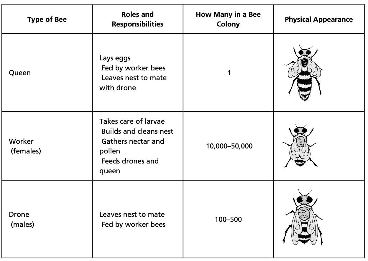 After coming home, Cindy observed her neighbor’s backyard beehive and realized that the bees were also part of a group. She decided to study the bees more closely. She discovered that not all bees are the same and that bees all work together in the group.