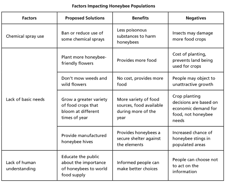 Cindy discovered that the number of honeybees in the world is dropping as a result of environmental changes. The chart shows some of the changes to the honeybees’ environment and some proposed solutions.