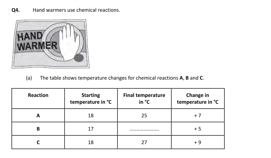 Which reaction, A, B, or C, would be best to use in a hand warmer?