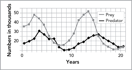 Dr. Osgood and her team are using a computer simulation to study the relationships between predator and prey. The simulation assumes that both predator and prey populations are minimally affected by other animals. The results of one version of the simulation are shown in the graph.