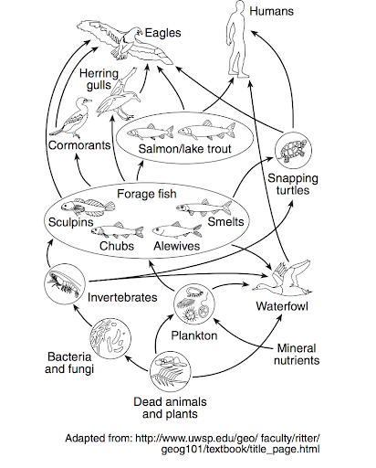 Examine the diagram below, which shows a typical food web that could be found in the Great Lakes area.