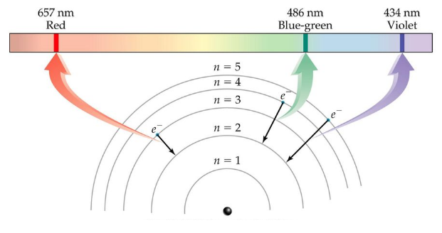 The figure shows different possible transitions of electrons as they move from higher energy states to lower energy states. Which transition will produce the spectrum line with the shortest wavelength and highest energy in this element’s atomic spectrum?