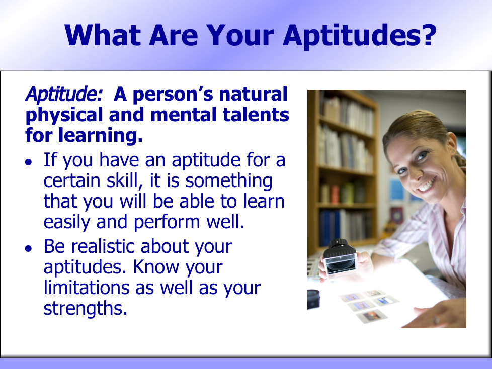 Having aptitudes and abilities that match your interests.