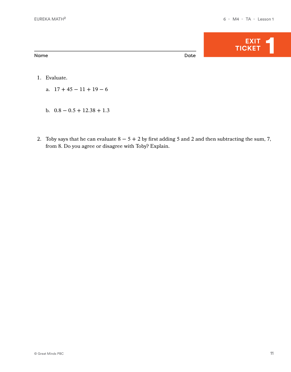 Toby says that he can evaluate 8-5+2 by first adding 5 and 2 and then subtracting the sum, 7, from 8. Do you agree or disagree with Toby? Explain.