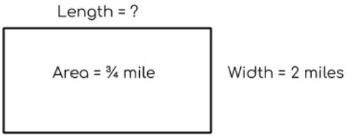 To find the LENGTH of the land, the area of the land must be divided by the width of the land. How long, in miles, is the strip of land? Show your work and simplify your answer.