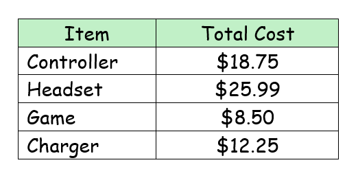 The table below reflects how much Tre spent on various items at the game store for his birthday! Tre's mom gave him a budget of $100 for his gaming items. How much money will Tre have left over if he buys 2 controllers, 1 headset, and 4 games?