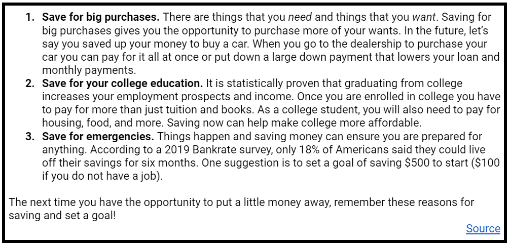 Step 1: Brainstorm goals you would like to save for. Some of the goals may be big, like saving for college, while others might be small, like saving enough to buy a new pair of sunglasses. They can even be something in between, like saving up for a bicycle. Come up with at least 10 reasons for you to save.