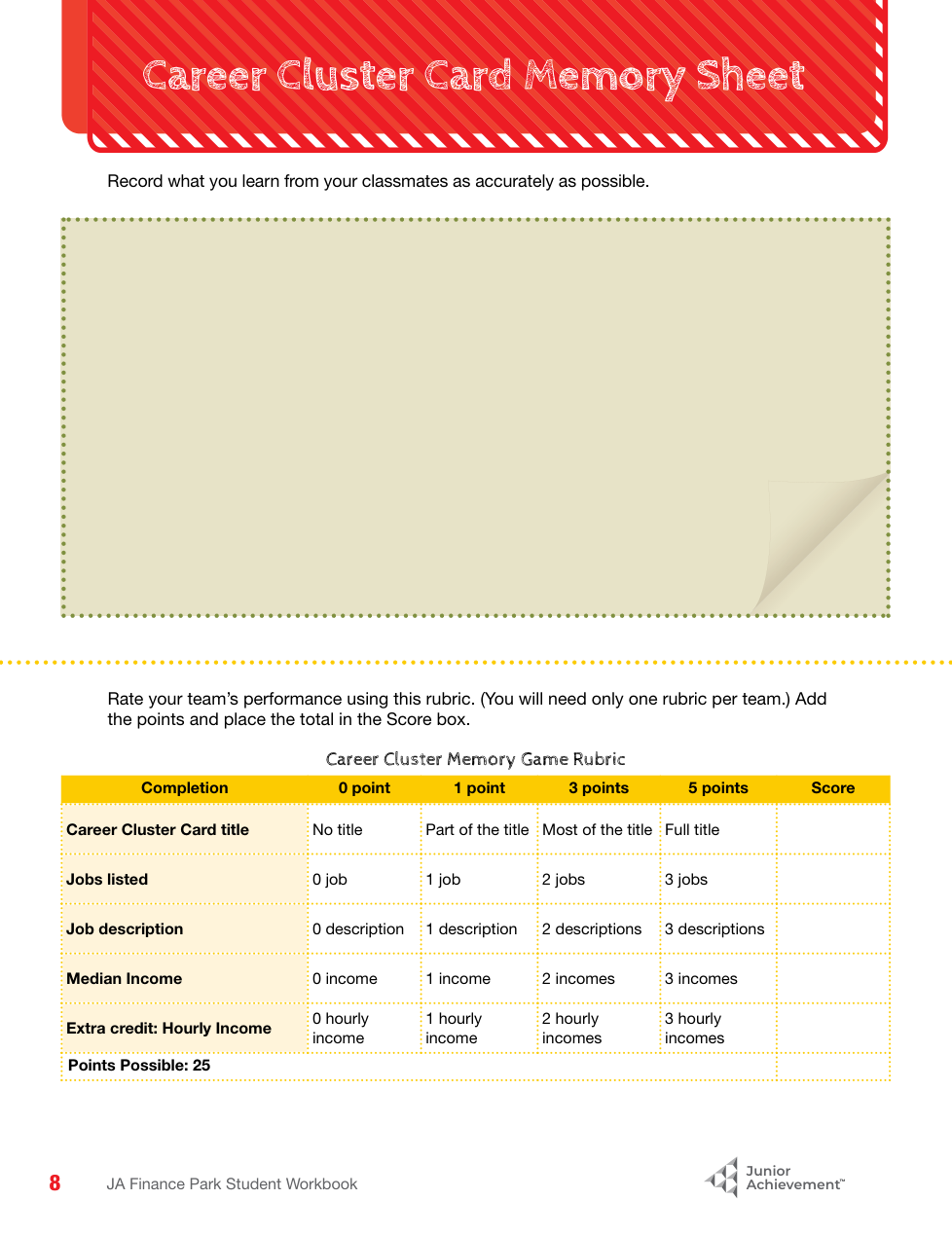 What is the purpose of the Career Cluster Card Memory Sheet?