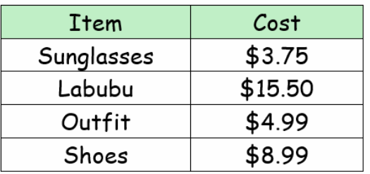 Now you try!!! Ellie is obsessed with Labubus! The table below shows how much money each item costs that Ellie spent on her new Labubu collection at the mall.