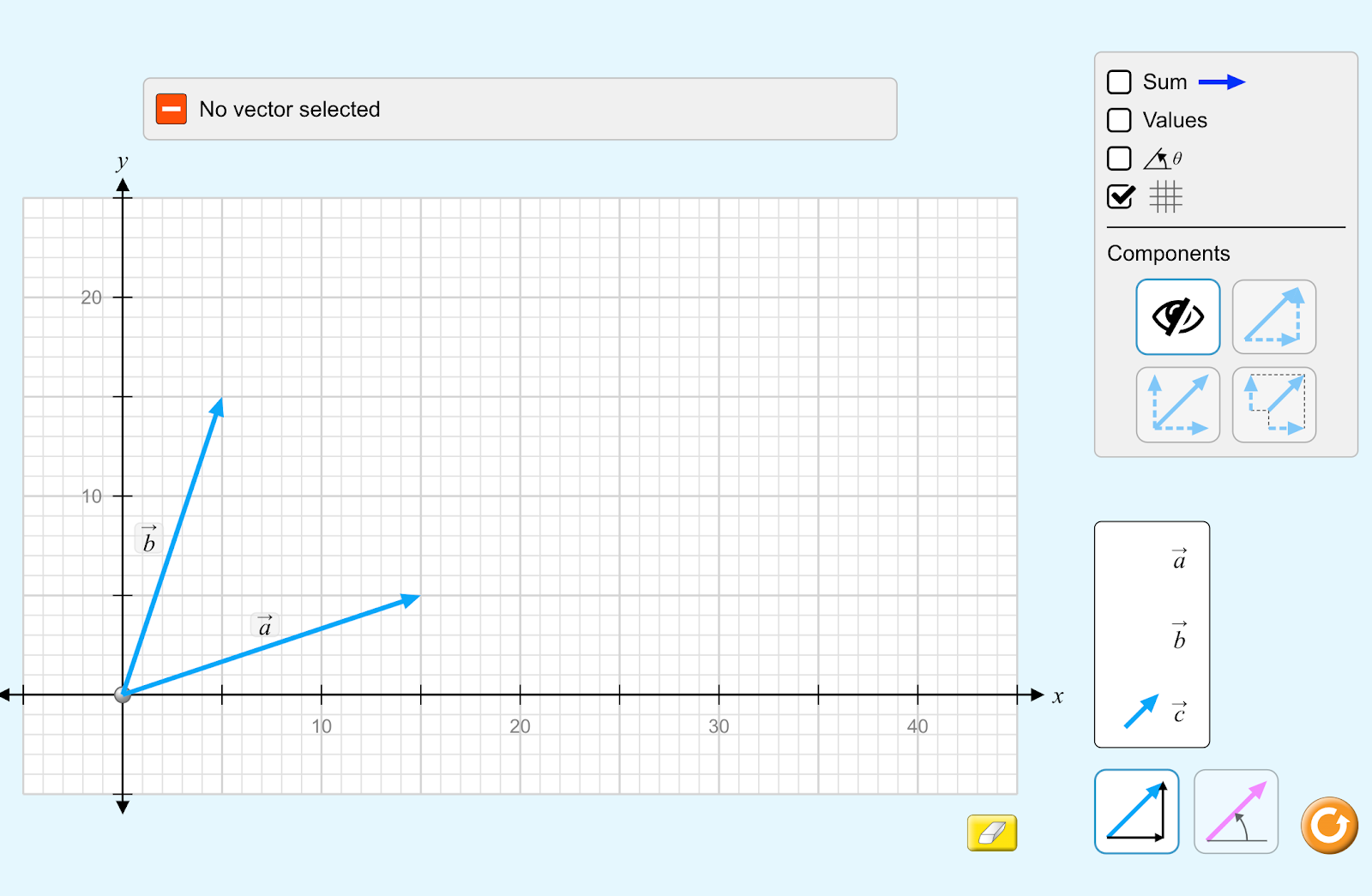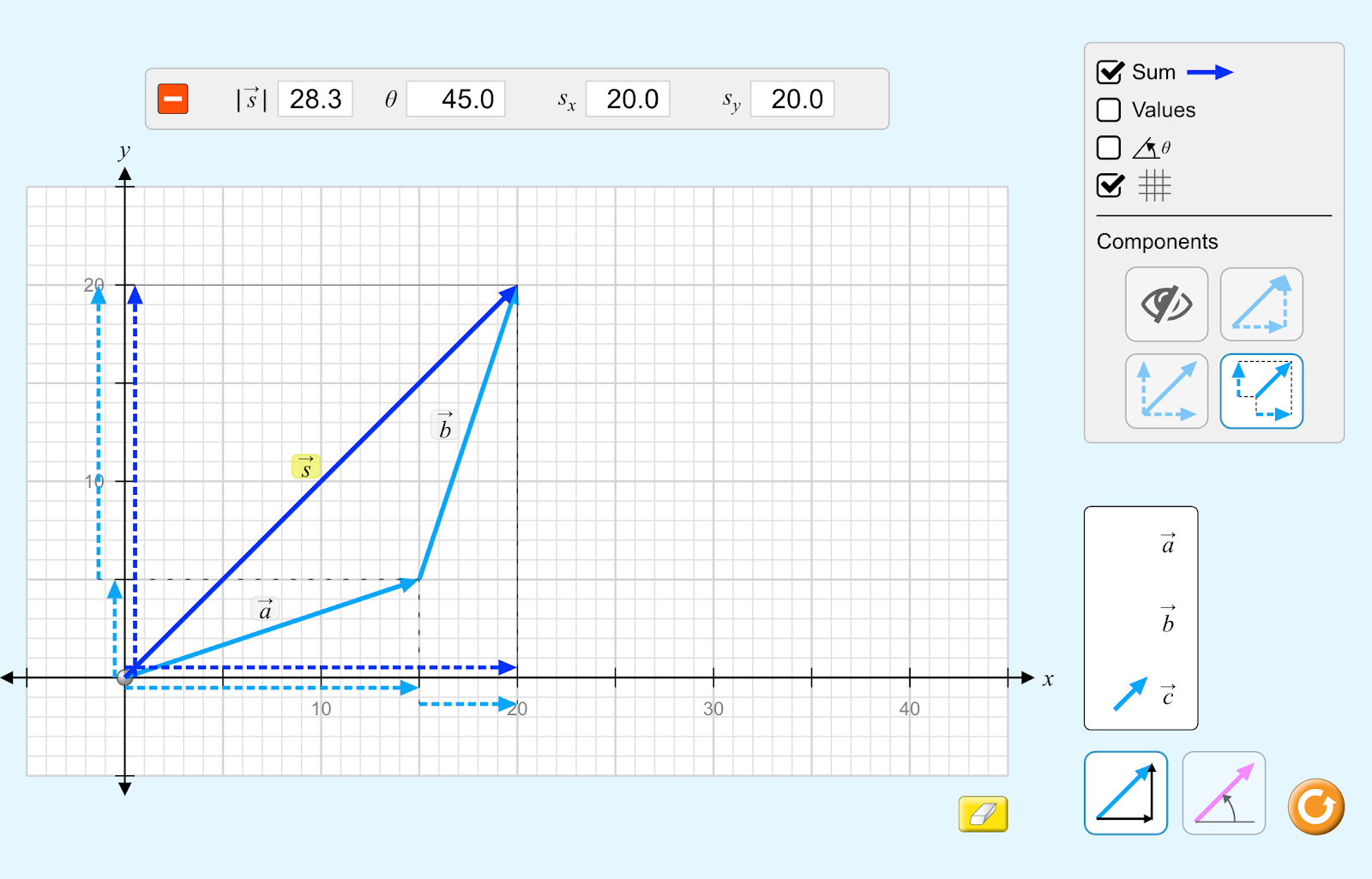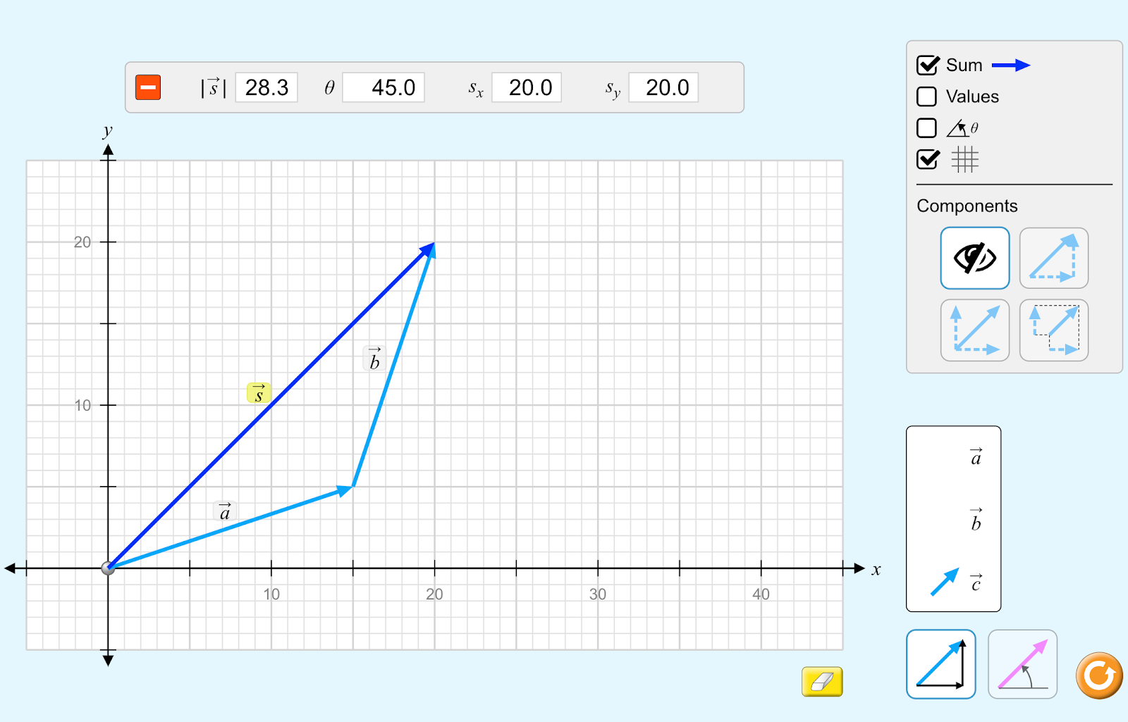 Turn on one of the "component views" like so. What is the relationship between the vertical components of a, b and s?