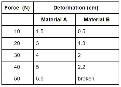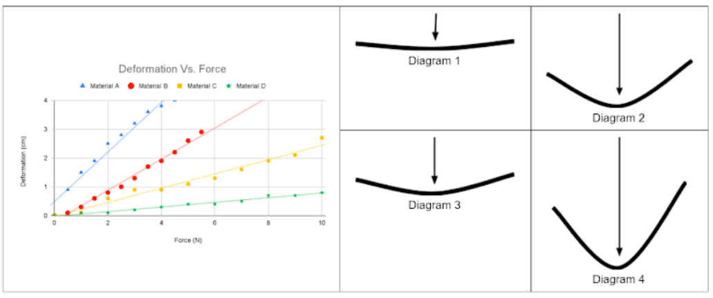 Below is a gaph of four different materials and the amount of deformation as the force was applied to each object. There is a diagram of the deformation of each object at aforce of 4N. Whichdiagram represents Material D tat 4N of force? Explain your answer.