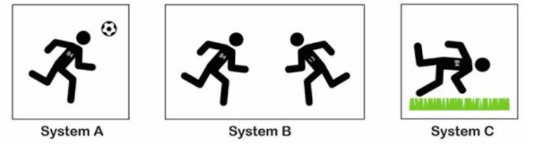 How would the amount of force on the head compare to the amount of force on the object it collides with, in each system A, B, and C?