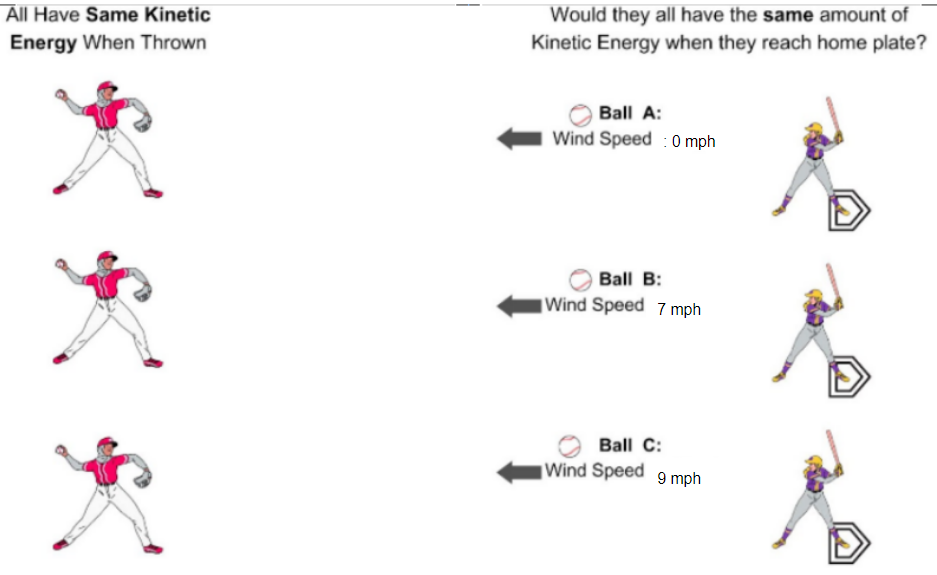 If all three balls (A, B, and C) had equal amounts of KE when they left the pitcher's hand, would they all have the same amount of KE when they reach home plate?