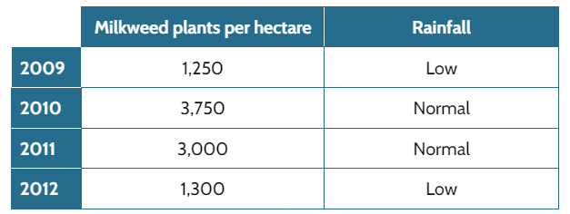 The monarch butterfly population changes every year, and scientists are concerned about what might happen to the population over time. The graph below is the data collected between 2009 and 2012 for the populations of monarch butterflies. The area of occupied forests is a method scientists use to estimate the number of butterflies.