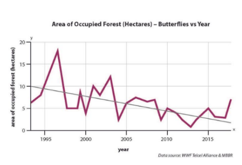 The graph shows the eastern monarch butterfly population from 1993 to 2018. The gray line is a trend line that shows the overall pattern of change in the amount of land occupied by butterflies over time. Remember, the area of occupied forests is a method scientists use to estimate the number of butterflies.