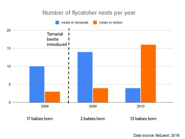 For hundreds of years, the willow flycatcher built its nest in willow trees. That’s how it got its name! However, over 100 years ago, humans planted a new plant along the rivers called tamarisk. The tamarisk was very successful at growing. Some people claim the tamarisk grew so well that it prevented new willow trees from growing. The willow flycatchers started to use tamarisks to build their nests instead of the willow trees.