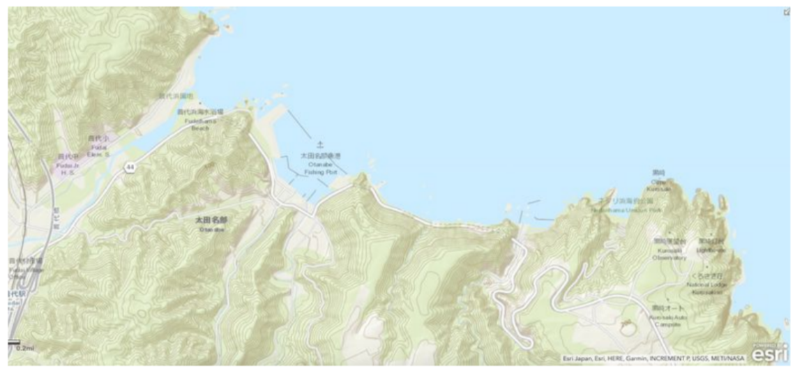 The map below shows an area called Fudai. This is a hilly region, and the darker areas on the map mean there is a steep incline and higher elevation, while the lighter areas are lower elevations or flatter.