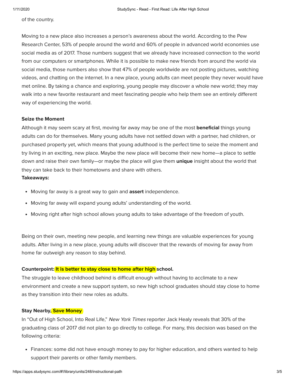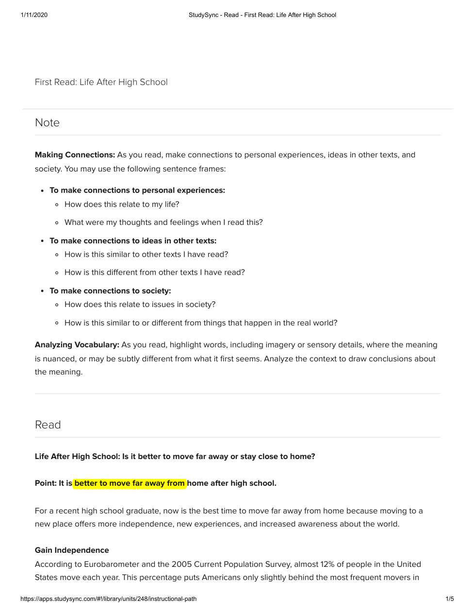 This formative explores the pros and cons of staying close to home versus moving away after high school. Students will identify claims and evidence from the text to support each perspective, enhancing their analytical skills.