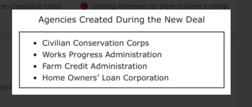 New Deal | arrow_right_alt | Security Exchange Commission-created to be a watchdog over businesses and the stock market to prevent fraud |