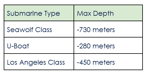 The chart shows the lowest elevations for three submarines.