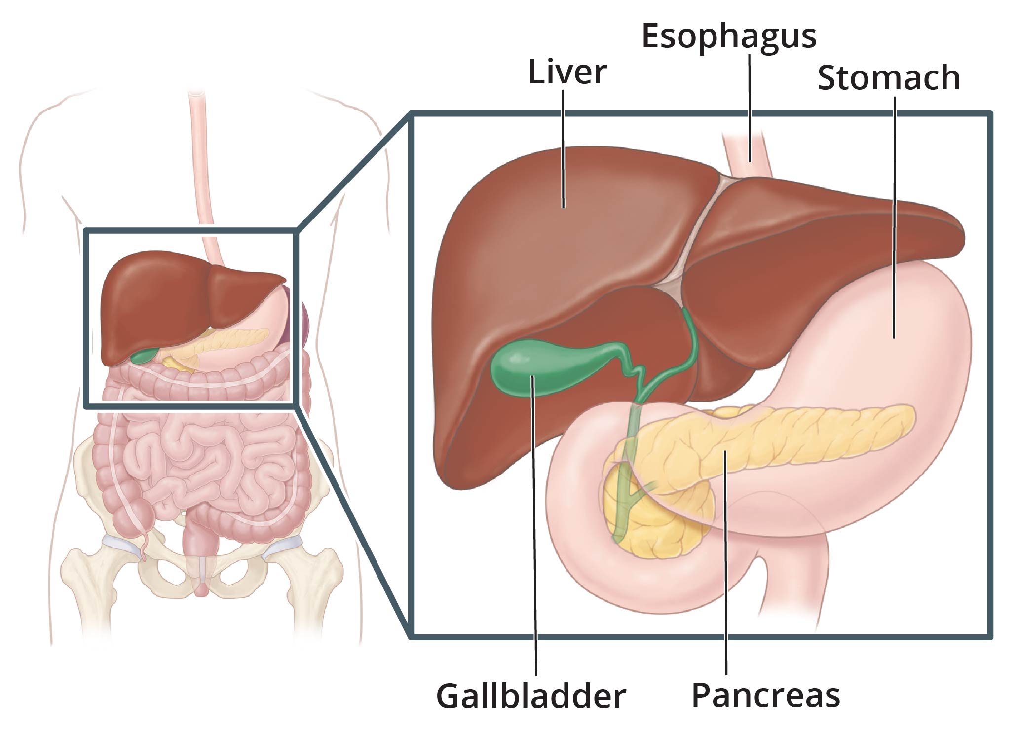 What organ helps in breaking down food (i.e., red meat to protein molecules to amino acid molecules) in the digestive system?