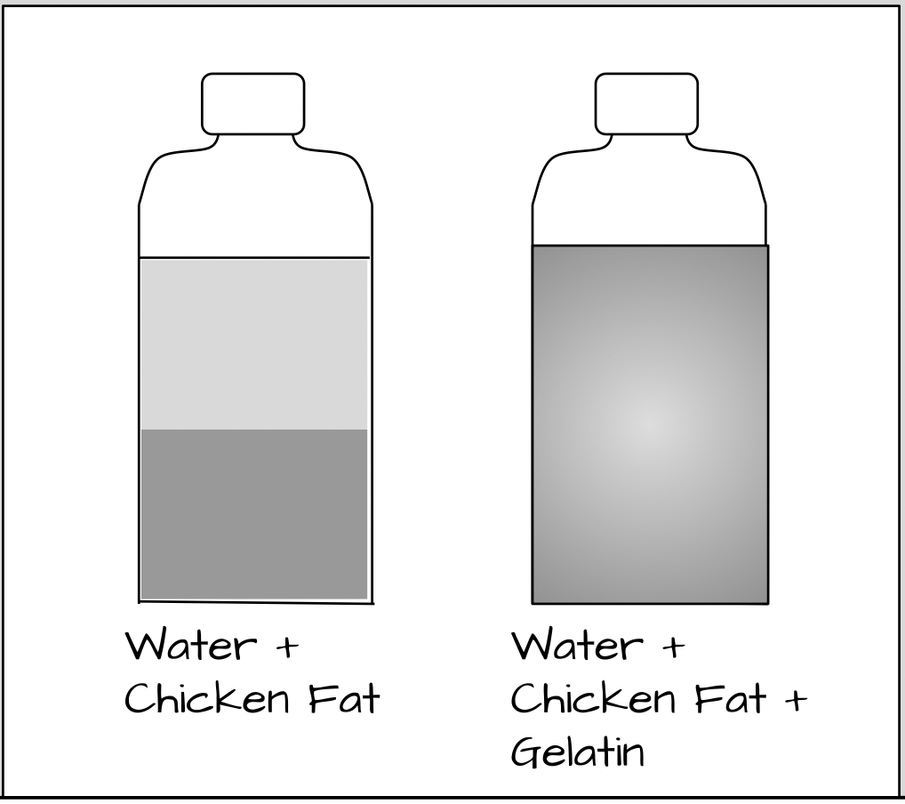 After figuring out which powder is flour, Keisha’s mom makes gravy. Keisha notices that two of the ingredients her mom uses are water and chicken fat. When the water and chicken fat are mixed together, the mixture separates into layers. When Keisha’s mom adds gelatin to the mixture and stirs, the gravy stays mixed.