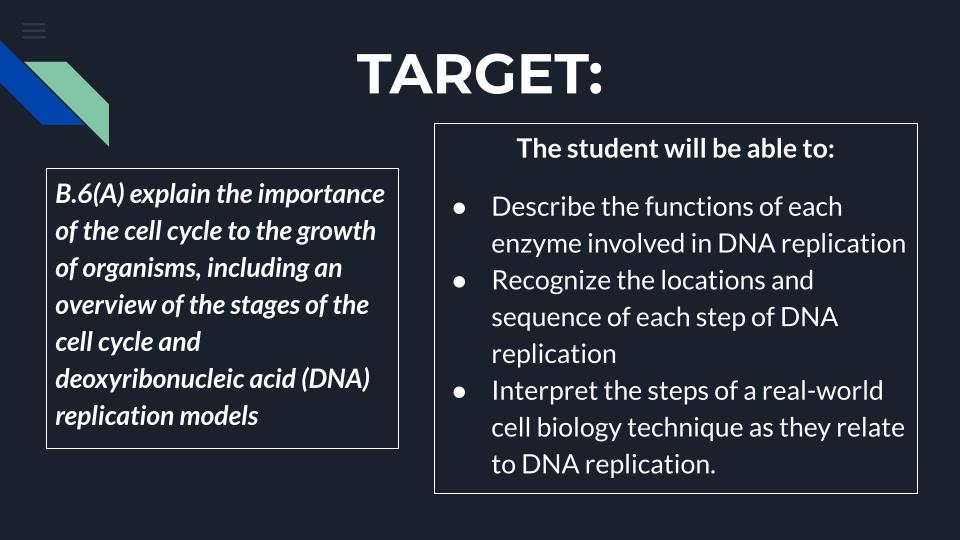 B.6(A) explain the importance of the cell cycle to the growth of organisms, including an overview of the stages of the cell cycle and deoxyribonucleic acid (DNA) replication models