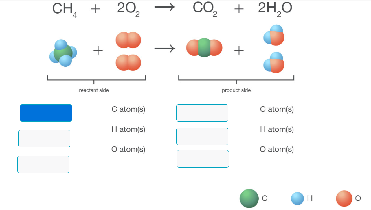 As methane burns, it reacts with oxygen and forms carbon dioxide and water. The chemical equation below models this chemical reaction. Examine each molecule represented in the chemical equation. Enter the numbers of each type of atom in the reactants and products.