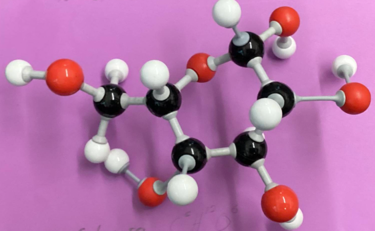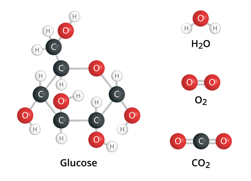 A student developed the four models of the molecules pictured. The first is a molecule called Glucose (C6H12O6) and is more complex than the three other molecules the student modeled, called: Carbon Dioxide (CO2), Diatomic Oxygen (O2), and water (H20)