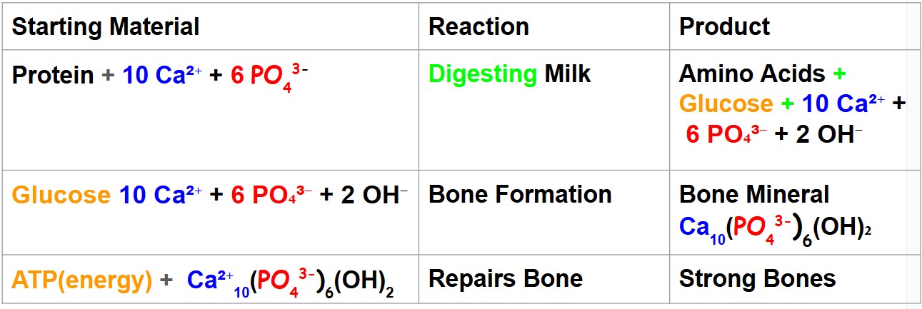 The table below shows how the molecules in milk are digested and rearranged in the body to support bone growth: