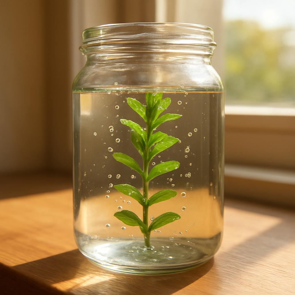 A student observes a small plant growing near a window. The plant produces oxygen bubbles and the leaves grow larger over time.