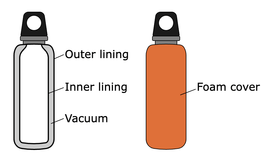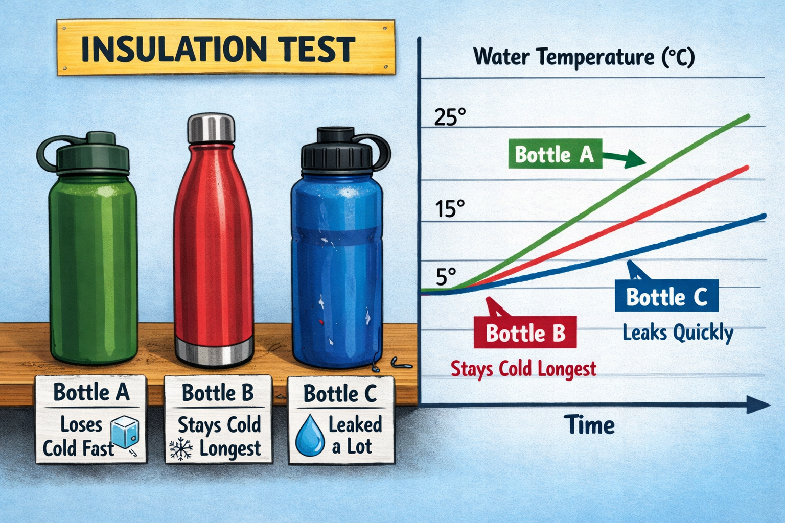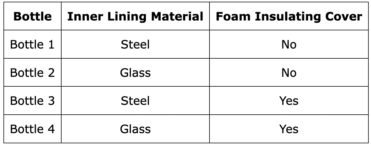 Three bottles are tested for insulation. Which characteristic of the water bottle should be used in a final design?