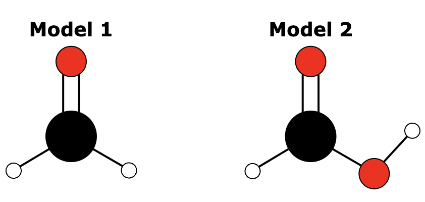 A chemist draws two molecular models. One model is drawn for formaldehyde (CH2O) and one model is drawn for formic acid (CH2O2). The chemist forgets to write the chemical name above each model. The models are labeled as Model 1 and Model 2, as shown in the figure.